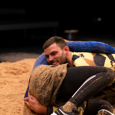 In ihrer Choreografie spürt die Basler Choreografin mit ihren beiden Performern dem Theatralischen nach, das dem Schwingsport eigen ist. Sie thematisiert die Körperbilder und stellt das Geschlechterverhältnis infrage, das in den Ritualen des Schwingens produziert wird.