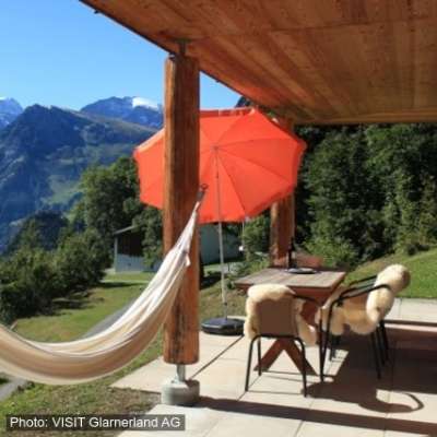 Sie verfügt über eine Balkon mit atemberaubender Aussicht auf die Glarner Bergwelt. Die Ferienwohnung ist sehr modern eingerichtet und verfügt über eine modern eingerichtete Küche mit Geschirrspüler, Glaskeramikherd und Backofen. Das Chalet bietet Platz für bis zu 5 Personen. Das Badezimmer verfügt über eine Dusche und WC. Ausserdem bietet die Ferienwohnung einen Gartensitzplatz, Grillplatz, separaten Eingang, einen Abstellraum, Radio, CD, Satelliten-TV, DVD, gratis Benutzung des WLAN sowie Waschmaschine/Tumbler.