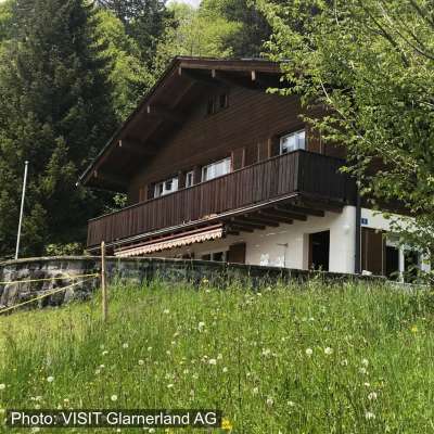 Das Chalet steht an ruhiger, sonniger Lage etwas oberhalb vom Dorf und Märchenhotel Bellevue. Den Panoramablick auf die Glarner Bergwelt geniessen Sie auf der weitläufigen Terrasse und dem Balkon.
