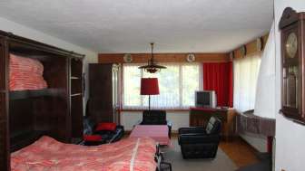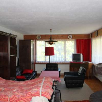 Gartensitzplatz mit Grill, Balkon und nach Absprache zusätzliche Spielwiese. Gemütliche 2 1/2 Zimmer-Wohnung, Wohnschlafzimmer ca. 50 m2 mit D'Klappbett, Kinderzimmer 3 Betten, Küche, Dusche/WC. Die Küche hat eine Mikrowelle anstelle eines Backofens.