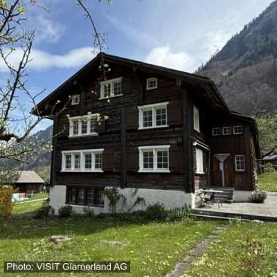 Ein Gartensitzplatz mit Bergsicht und eine Wiese laden zum Verweilen ein. Die Einkäufe können in zehn Minuten zu Fuss oder in zwei Minuten mit dem Auto im Volg Linthal getätigt werden.