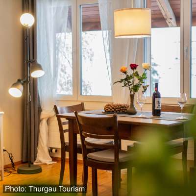 Die 3-Zimmer-Ferienwohnung Frostenegg liegt auf einem Hügel in Nussbaumen mit einer herrlichen Aussicht auf den Nussbaumersee und dessen ländliche Umgebung.
