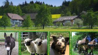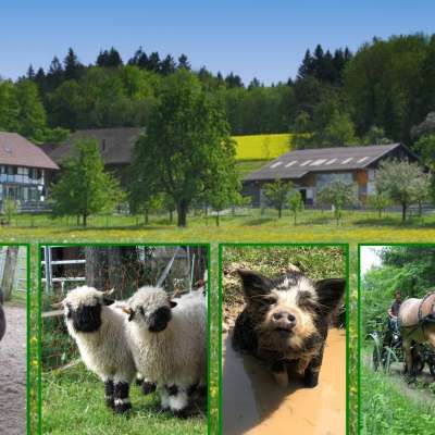Pferde, Esel, Walliser Schwarznasenschafe, Kune-Kune-Schweine und Katzen machen den Hof zu einem lebendigen Ort, an dem Landwirtschaft hautnah erlebbar wird. Kinder können Esel striegeln, mit ihnen Spaziergänge durch den Wald unternehmen oder beim Versorgen der Tiere mithelfen. Die wolligen Schafe lassen sich gerne kraulen, während die Schweine für heitere Momente sorgen. Ein besonderes Erlebnis ist eine Kutschenfahrt mit den imposanten Kaltblutpferden, die eindrucksvolle Ausblicke eröffnet.