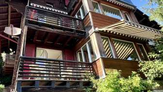 In dieses ehrwürdige Alpenchalet von 1937 an bester Aussichtslage möchte man sich einfach gleich einkuscheln. Vor allem wenn die Tage kürzer werden, sich die Bäume verfärben und sich allmählich der Winter ankündigt. Versteckt zwischen Tannen, wirkt es schon von aussen so richtig urchig und gemütlich – mit einer Sichtsteinmauer, seiner Holzfassade und den vielen Balkonen unter dem schützenden Satteldach.