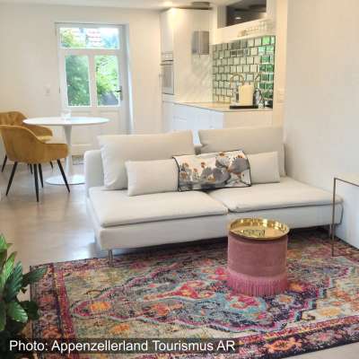 Das kleine Loft befindet sich im Erdgeschoss eines herrschaftlichen Hauses und ist sehr ruhig gelegen. Es ist komfortabel und modern eingerichtet: edles Bad in Schwarz und Messing, weisse Kalkputzwände, geheizter Design-Betonboden, gut ausgestattete Küchenkombination. Der grosse Raum ist unterteilt in Bereiche für Kochen, Essen und Schlafen. WLAN und Waschmaschine sind vorhanden. Dank der vielen Fenster ist das Loft von Licht durchflutet. Ein direkter Zugang zum Garten führt zu einem Sitzplatz. Die Aussichten auf Hügel und Berge machen Lust auf Wandern und Biken. Bahnhof und Dorfplatz mit Restaurants und einem Einkaufsladen sind nur wenige Schritte entfernt.