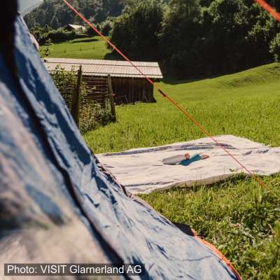 Das Zelt-Camp im hinteren Glarnerland auf dem Biohof Tschingelgut in Rüti bietet Ruhe, Aussicht sowie diverse Wander- und Bikemöglichkeiten direkt vom Zeltplatz aus. WC und Dusche sind vorhanden. Bei schlechtem Wetter bietet der Stall Unterschlupf.