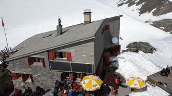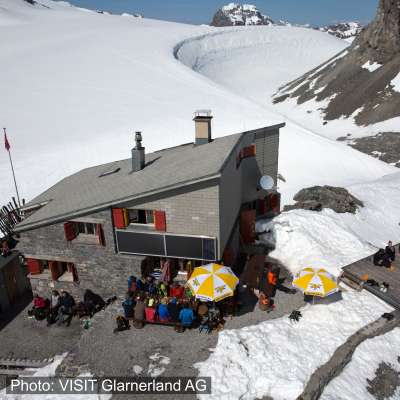 Umgeben von Gletschern. Über die weite Fläche des Hüfifirns schweift der Blick durch das Maderanertal bis zu den Berner Alpen, auf der Gegenseite dominiert der Tödi das Blickfeld. Um die erneuerte Hütte mit historischem Charakter fasziniert der grosse, vom Wind geformte Schneetrichter, ein Windkolk. Ausgangspunkt für Ski-, Hoch- und Gletschertouren.