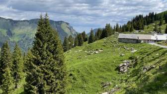 Der schöne Arvenwald etwas weiter oben lädt zum Verweilen, die Alphütten und somit das Alpleben sind ganz nah.