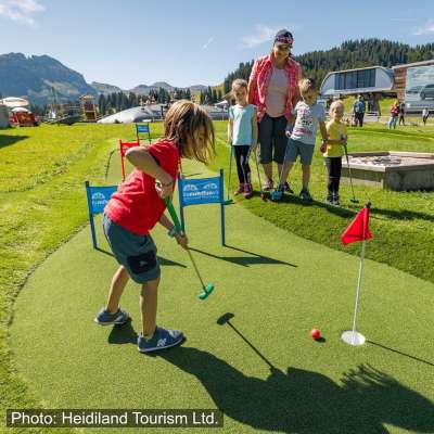 Die Adventure Golf-Anlage neben dem Bergrestaurant Prodalp bietet eine abwechslungsreiche 12-Loch-Anlage. Grosseltern, Eltern und Kinder können hier gemeinsam den verwinkelten Munggä-Bau erkunden und den Minigolfball den legendären FLOOMZER hinunter schiessen.