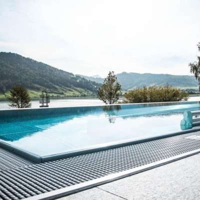 Vier verschiedene Becken laden zum Schwimmen ein, den Erholungsmoment zu erleben oder einfach nur das Wasser, die Wärme und den Ausblick zu geniessen. Zusätzlich sorgt die 65 Meter lange Black-Hole Rutsche mit Infinity-Jump für Abwechslung.