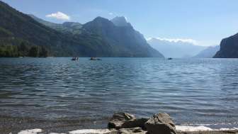 Von hier aus hat man den Blick über den ganzen Walensee. Der Sandstrand ist umsäumt von Bäumen und bietet je nach Sonnenstand auch Schatten.