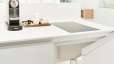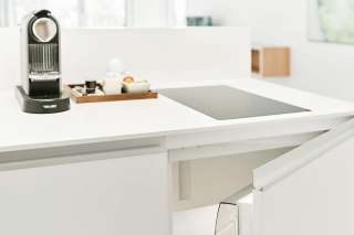 - Küchenzeile mit Küchenausstattung, Kühlschrank und Mikrowelle