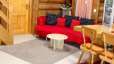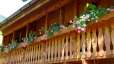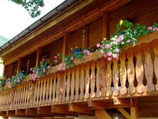 Die Ferienwohnung im ersten Stock ist gemütlich und sehr rustikal eingerichtet. An den Wänden und Decken sind Holzbalken sichtbar. Zur Wohnung gehört eine Veranda.
