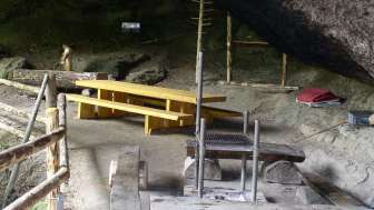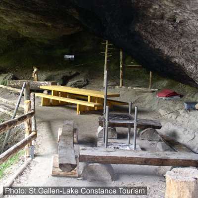 Erreicht man die Nagelfluh-Höhle gibt es einen grossen Tisch mit Bänken und eine schöne Feuerstelle mit einem Holzvorrat. Hier lässt es sich gut erholen für den bevorstehenden Rückweg oder für die weitere Wanderung.