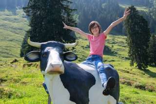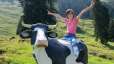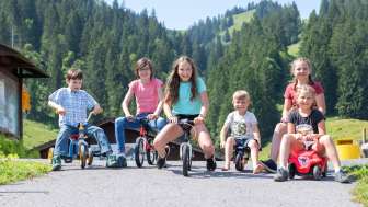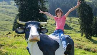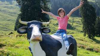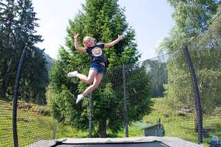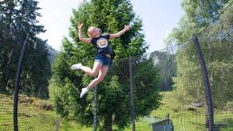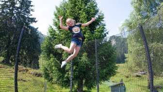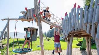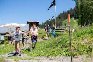 Ein Holzdrache zum Klettern, ein grosses Trampolin, ein Sandkasten mit Spielsachen, ein kleines Holzhaus, verschiedene Fahrzeuge wie Traktoren und Autos stehen für die kleinen Gäste bereit. Gemütliche Picknick Plätze am Schatten laden zum Pause machen ein.