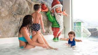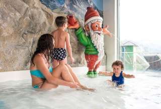 Im Erlebnisbad des Märchenhotels kommt die ganze Familie auf ihre Rechnung: Die Kleinsten planschen im 32 Grad warmen Baby- und Kinderbecken und lassen sich von einem Wasserfall berieseln.