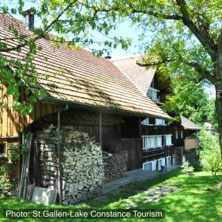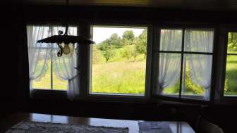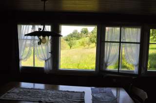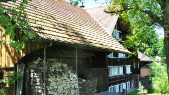 Das Ferienhaus zur Alleinbenützung steht mitten im Wiesland. Es bietet viel Platz im und ums Haus.