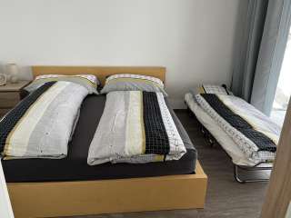 - Ein Schlafzimmer mit Dppelbett und Platz für Zusatz-Klappbett
