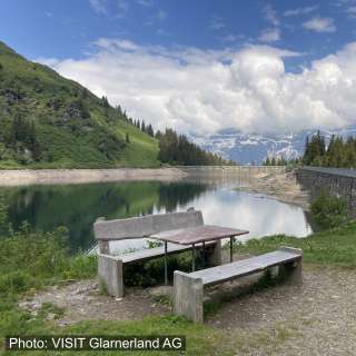 Feuerholz, ein Rost, ein Tisch – alles ist hier vorhanden. Wer die Rute mitnimmt, kann direkt unterhalb am Seeufer das Mittagessen fangen. Fischerpatente gibt’s beim Berghotel Mettmen.