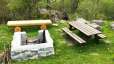 Die eingezäunte Feuerstelle verfügt über ein gut besetztes Holzlager und einen schönen Brunnen. Die Feuerstelle ist leicht am Hang gelegen und verfügt über einen Rost, welcher auf zwei verschiedenen Höhen angebracht werden kann und Platz für einige Grilladen bietet. Eine schöne, neue Bank ergänzt die bestehende Bank-Tisch-Kombination und bietet zusätzliche Sitzmöglichkeiten an der Feuerstelle.