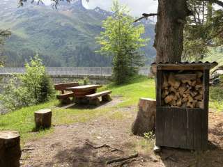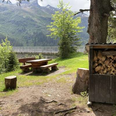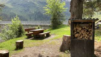 Wunderschön von Bäumen umgeben liegt diese Feuerstelle an einem schattigen Plätzchen direkt nach der Staumauer am Stausee Garichti. Perfekt gelegen auf 1625 m.ü.M., um an einem heissen Sommertag gemütlich draussen zusammenzusitzen.