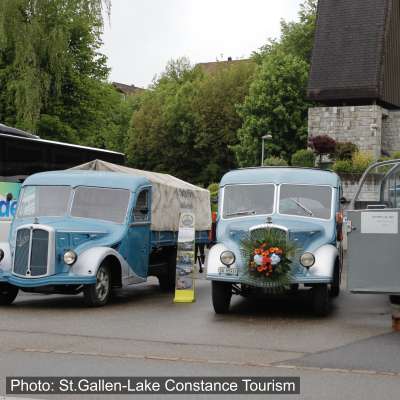 In den Sommermonaten kann die Museumsbesichtigung mit einer Oldtimer-Busfahrt ergänzt werden.