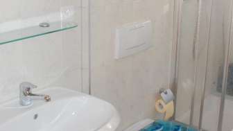 - In der abgeschlossenen Nasszelle befindet sich eine Dusche, WC, Waschbecken mit Unterschrank und einem Handtuchheizkörper. Ein Haartrockner ist ebenfalls vorhanden.