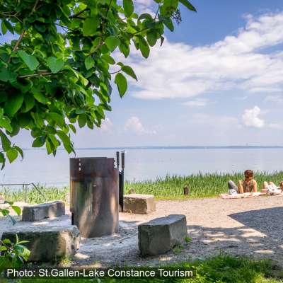 Bei dem idyllisch gelegenen Frauenbad in Frasnacht bietet sich einem eine fantastische Aussicht auf den funkelnden Bodensee – Ferienfeeling pur. Für das gemütliche Beisammensein stehen eine Feuerstelle und grosse Steine zum Sitzen bereit. Wer also eine Pause von der schweisstreibenden Velotour braucht, ist hier genau richtig.