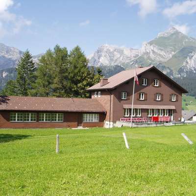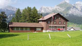 Das Frauenfelderhaus liegt 1160 müM. auf einer Geländekante oberhalb von Wildhaus SG gegenüber des Säntis.