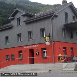 In den Farben Rot und Grau erstrahlt das Gasthaus entsprechend ihres Nachbars, der Autobetriebe Sernftal. Das Gasthaus befindet sich denn direkt gegenüber dem Bahnhofsgebäude, wo einst die Sernftalbahn Halt machte. Im Interieur ist es gemütlich mit dem altem Holztäfer und dem neueren Holzboden. Weniger Zimmer stehen für Wanderer, Kletterer vom Aatereistei, Golfer, Radler und viele andere zur Verfügung. Tipp des Hauses: Kleine Karte, Menüs auf Vorbestellung.