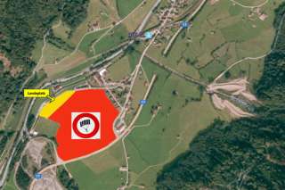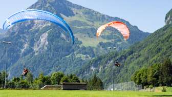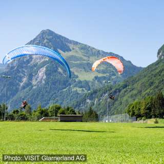 Der offizielle Landeplatz in Rüti. Von dort aus erreichst du in ca. 10 Minuten Fussweg die Talstation der Standseilbahn Braunwald, die dich zum nächsten Flug hochfährt.