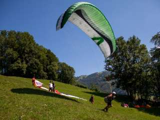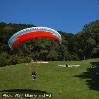 Nach einer kurzen theoretischen Einführung (30min) bist Du am Gleitschirm. Du erlernst die Starttechnik und nach ein paar Laufübungen hebst Du das erste Mal ab. Nun wird die Höhe und Weite der Flüge am Übungshang stetig ein wenig grösser. Je nach Können und Wohlfühlen kannst Du dabei bis zu 200 Meter weit und 20 Meter hoch fliegen.