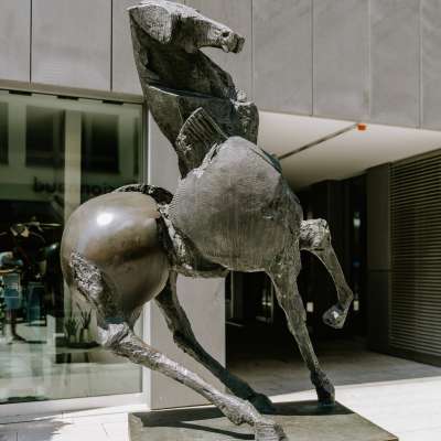 Die expressiven Bronzen von Nag Arnoldi zeigen Einflüsse von Marino Marini und Pablo Picasso, aber auch von der präkolumbianischen Kunst. Seine Werke haben eine klare Identität. Die Einmaligkeit der Struktur der aufgebrochenen Gussfläche steht in starkem Gegensatz zu den stellenweise polierten Oberflächen. Dabei spielen das Licht, die Reflexion und die Immaterialisierung eine ganz bedeutende Rolle. Das Thema ist der Mythos Pferd und Mensch, der zwischen Freude und Schmerz dargestellt wird.