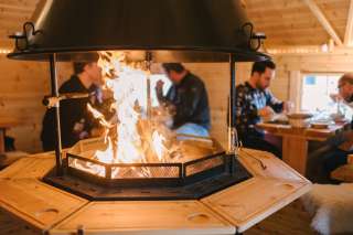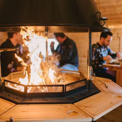 Die Grillhütte bietet Platz für bis zu 24 Personen – ideal für kleine Bankette oder Teamevents. In der Mitte sorgt eine offene Feuerstelle für Wärme und Atmosphäre. Fleisch, Gemüse oder Marshmallows – alles wird direkt am Feuer grilliert. Perfekt für gemütliche Stunden in geselliger Runde.