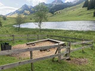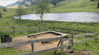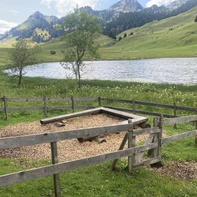 Am wunderbar gelegenen Gräppelensee gibt es zwei Feuerstellen, die nur gerade knapp 100 m auseinander liegen. Die eine liegt an der Sonne, die andere im Schatten einiger Fichten. Beide sind umzäunt, damit die Kühe, die hier den Sommer verbringen, nicht hinein können. Die Feuerstelle ist auf drei Seiten betoniert und verfügt über einen rechteckigen Rost, der in der Höhe nicht verstellt werden kann. Für die Anzahl der Bänke ist er eher zu klein. Zudem ist er leider etwas verbogen worden. Der Boden um die Feuerstelle herum, wo auch drei Bänke stehen, ist mit Holzschnitzeln bestreut. Daneben steht ein Tisch mit zwei Bänken. Es gibt einen riesigen Holzvorrat und auch ein Beil, mit dem man die Scheite noch weiter spalten kann. Bei meinem letzten Besuch stand sogar eine Grillzange zur Verfügung. Die Feuerstelle im Schatten ist ebenfalls auf drei Seiten betoniert und verfügt über den gleichen Rost sie die Feuerstelle an der Sonne. Das ToiToi-WC steht in einem Häuschen an der Strasse. Kinderwagentauglich: nein, Holz: ja, Trinkwasser: nein, WC: ja, Kapazität: ca. 35