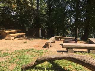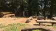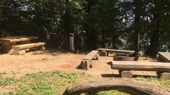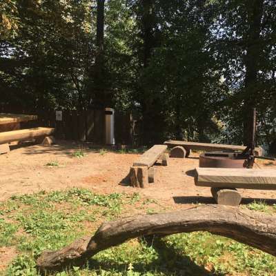 Gemütliche Feuerstelle im Wald mit Sitzbänken und Grillrost. Daneben befindet sich ein Spielplatz.