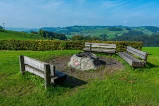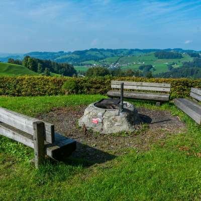 Unmittelbar neben den neuen Feuerstellen findet man noch die alte Schweizer Familie Feuerstelle. Diese ist besser als die neuen, da der Rost in der Höhe verstellt und zur Seite geschwenkt werden kann. Zudem liegt sie oft im Schatten der nahen Bäume. Hier stehen zwei Bänke, aber kein Tisch zur Verfügung.