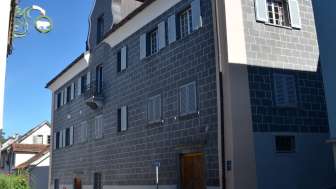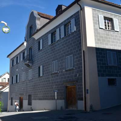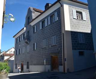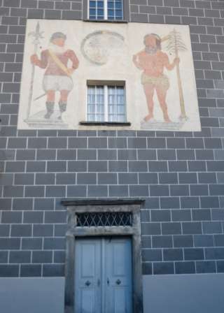 Die Quaderimitationsmalerei an der Fassade, die erst hoch über der Gasse liegende erste Fensterreihe sowie das Walmdach über dem massigen Körper zeigen es: hier steht ein Herrschaftshaus. Oberhalb des zierlichen Balkons thront harmonisch ein Sentergiebel, an ortsfremde Baukultur erinnernd. Doch Wildmannli an der Westfassade lehrt einem, dass man im Zehngerichtebund Zuhause war.