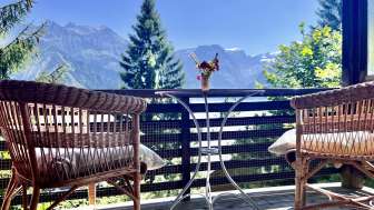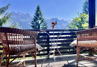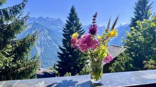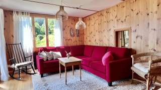 In dieses ehrwürdige Alpenchalet von 1937 an bester Aussichtslage möchte man sich einfach gleich einkuscheln. Vor allem wenn die Tage kürzer werden, sich die Bäume verfärben und sich allmählich der Winter ankündigt. Versteckt zwischen Tannen, wirkt es schon von aussen so richtig urchig und gemütlich – mit einer Sichtsteinmauer, seiner Holzfassade und den vielen Balkonen unter dem schützenden Satteldach.