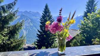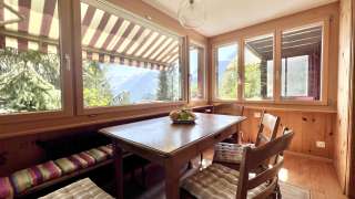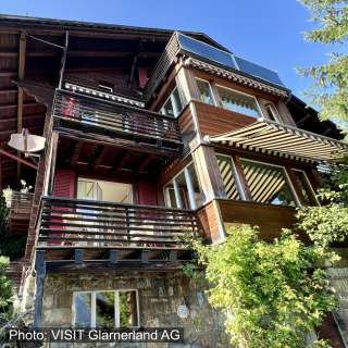 Dieser einladende Eindruck bestätigt sich innen aufs Schönste. Viel Holz sowie original erhaltene Elemente wie Türen, Treppengeländer, Dielenböden, gusseiserne Öfen und Lavabos in den Gängen sorgen für eine warme, gleichzeitig originelle Behaglichkeit, wie man sie in keinem Haus mit neuerem Baujahr findet. Und doch ist die Wohnung in der ersten Etage überraschend geräumig und hell. Grosse Fenster lassen viel Licht herein und geben vor allem den Blick frei in die majestätische Bergwelt, die die Sonnenterrasse von Braunwald umgibt.