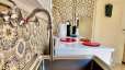 Von einem Flur gehen jeweils sowohl das Bad, ein separates WC, die Küche mit eigenem Balkon sowie ein Schlaf- und der Wohnraum ab. Die Küchen und Bäder sind charmant in die Jahre gekommen – mit Geschick ist hier Bestehendes wie die gestemmten Naturholztüren und die Durchreichen zum Wohnzimmer mit Neuem auf einzigartige Weise miteinander kombiniert.