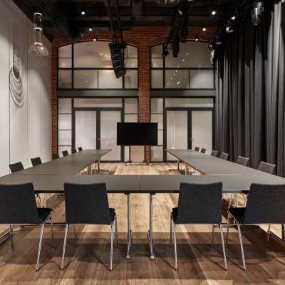 Durch die schalldichte Verglasung werden die Eventbesucher selbstverständlich nicht durch Geräusche gestört. Auch gibt es durch die verdunkelbaren Fenster die Möglichkeit, vertrauliche Inhalte vor anderen Gästen zu schützen. Dieser Raum hat auch Zugang zur Terrasse, welche als Location für das Mittag- oder Abendessen und die Pausen dienen kann.
