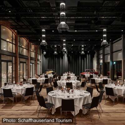Ein Bereich der Eventhalle mit optionaler Einsicht in die authentische Oldtimer-Werkstatt.