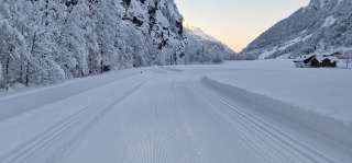 Anschliessend führt die Loipe über eine Rundstrecke von 1.8 km durch die Tierfedebene und auf dem Rückweg entlang der malerischen Linth. Zwischen Linth und Loipe befindet sich ein Saum von raureifbehängten Bäumen.