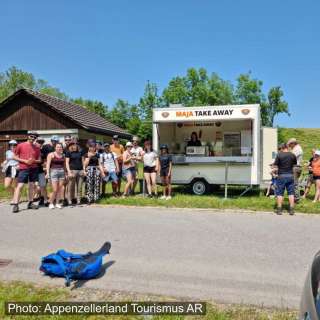 Hungrige und Durstige verköstigt Maja Maier beim Take-away-Stand auf dem Chistenpass im Wolfhäldliger Weiler Sonder. Im Angebot sind erfrischende Getränke, selbst gemachter Kartoffelsalat, Schnitzelbrot, Pommes frites und Würste vom Grill - eine ideale Stärkung, um den zweiten Teil des Witzwegs in Angriff zu nehmen.