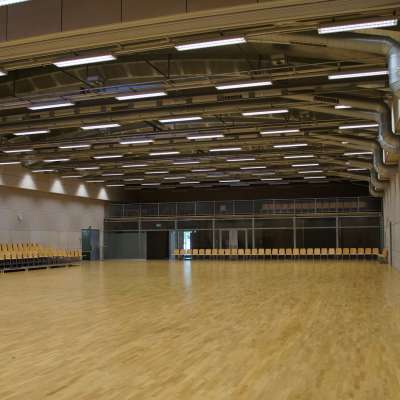 Die ganze Mehrzweckhalle ist mit einem Parkettboden ausgestattet.