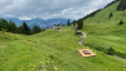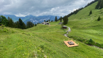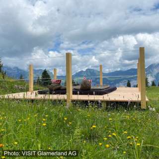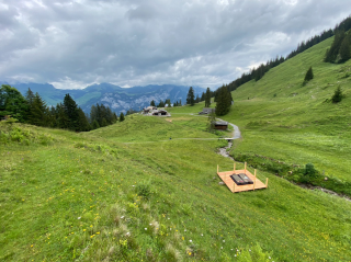 Plattform 3 ist kleiner und mobil. Sie wird je nach Weidegang an verschiedenen Orten unterhalb des Berggasthauses platziert und bietet immer eine neue Aussicht.