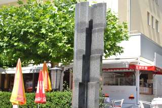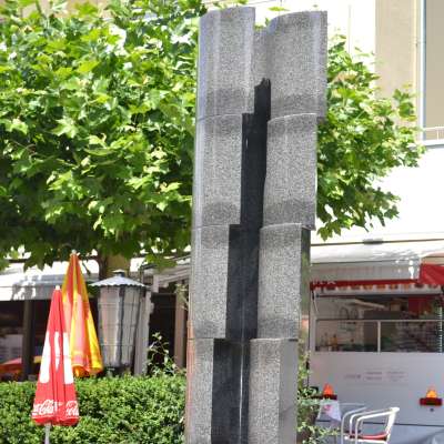 Die Skulptur aus dunklem Granit ist 300 cm hoch. Sie besteht aus sechs gleichen Elementen, je 50 cm hoch und jeweils um 15 Grad verdreht.