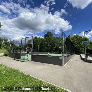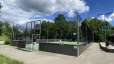 Multifunktionsspielfläche mit einem kleinen Calestanics-Geürst und einem Street-Fussballfeld.