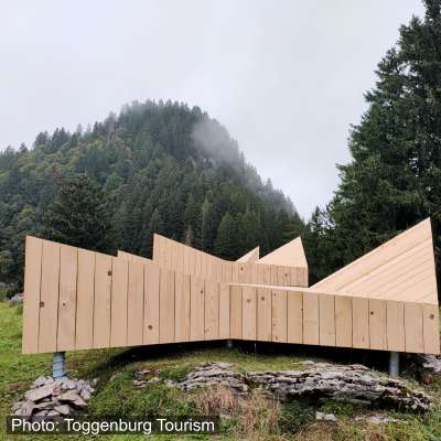 Statt auf eine Leinwand öffnet sich der Blick in die Weite: die sieben Gipfel der Churfirsten beeindrucken auf der gegenüberliegenden Talseite. Licht und Wolken verändern das Bild mit jeder Minute. Ein Ort, um sich niederzulegen und die Natur wirken zu lassen.